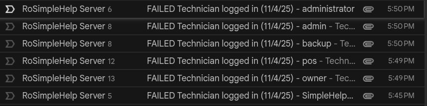 Just an FYI - we’ve been simple-help users for over 10 years. Never had people banging on the actual technician login, but today it started with some common user names and such: